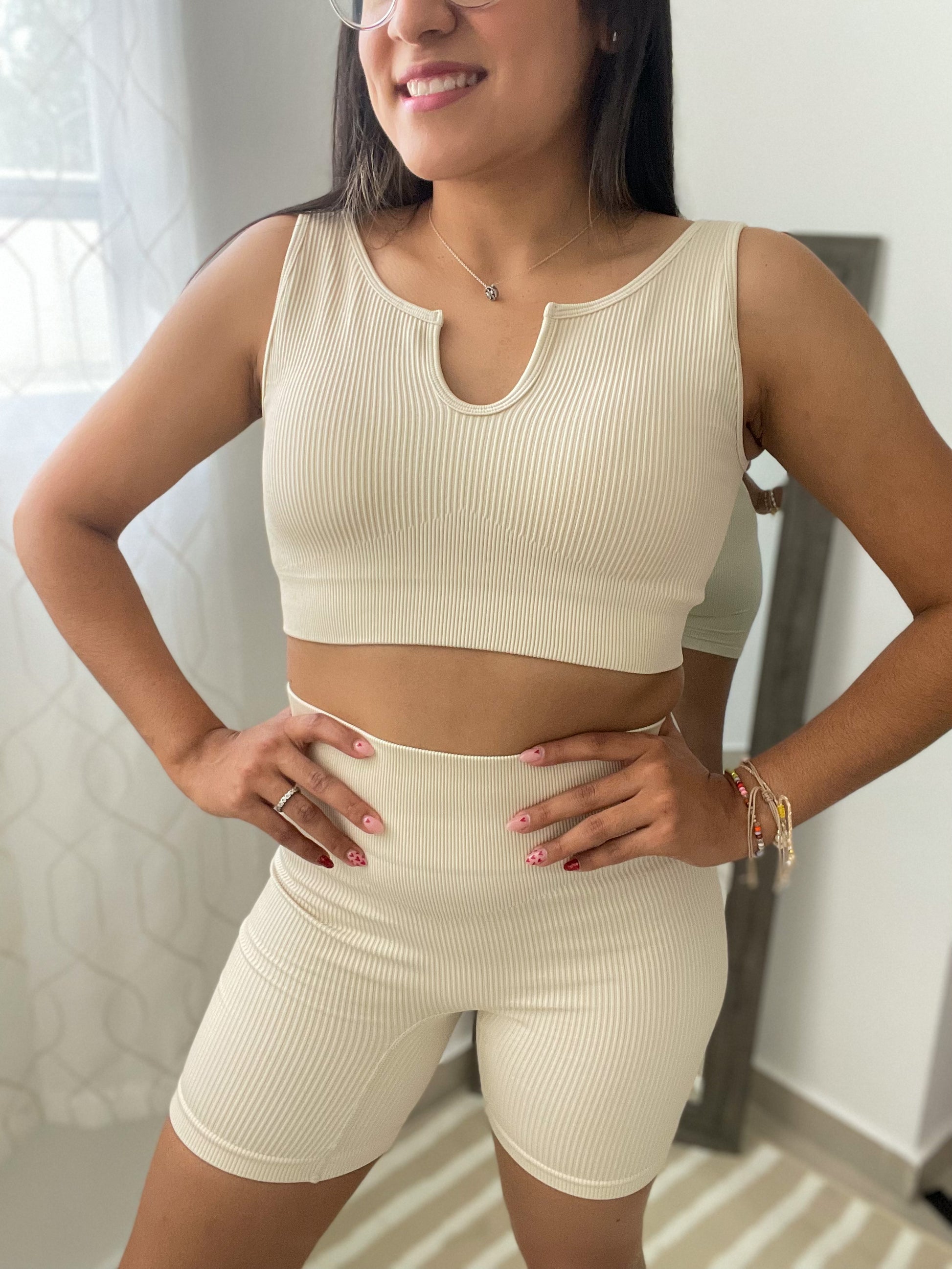 Seamless high waist active crop top and biker short set.